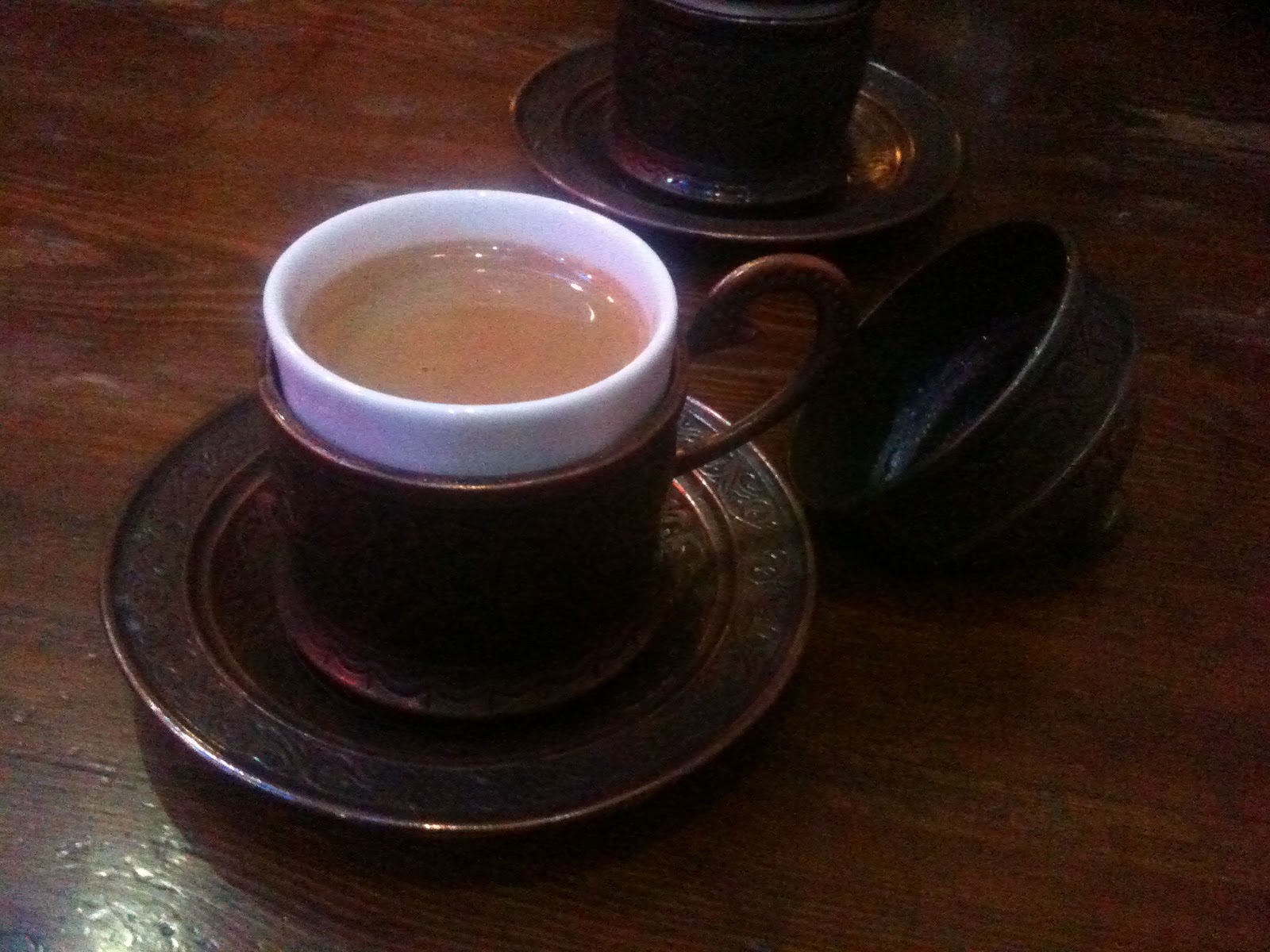 gyönyörű réz kávéscsészében, amiben egy porcelán csésze ült, és egy réz kupakja is volt, csodásan habos kávé. Az illata ínycsiklandó és kóstolás után édes, selymes ízű kávéíz marad a szájban, ami minden édesítőszer nélkül édes. Sehol a már ismert keserű íz.