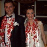 Szoval ezzel az ajandékkal felszerelkezve az ember beall a sorba, ami a fiatal parhoz vezet, hogy feltüzhesse ezt az aranymedalt vagy a pénzt a menyasszony vagy a völegény nyakaba akasztott fehér selyemszalagra. Külön erre a célra all valaki mellettük és tartja a gombostüket, mert ugye azt senki nem hoz magaval. (Persze sokan hoznak arany karkötöt vagy nyaklancot, amit mind raadnak a menyasszonyra vagy völegényre (ilyenkor mar férj és feleség). Mi természetetesen a menyasszony szalagjara tüztük az aranyat, lévén a menyasszony vendégei voltunk. Képzeljük el, amikor 5-600 vendég van a lagziban, a parnak végig kell allnia, mig az összes atadja az ajandékot, fényképezkedik, puszi stb.