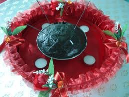 A hennat mar elötte összekeverték vizzel, igy kenhetö allapotuva valt, illata jellegzetes, mint a frissen vagott fü. Ezt a hennat egy talcara tették, köréje gyertyakat, amiket meggyujtottak, és ezt a talcat hoztak a menyasszony utan miközben énekeltek.